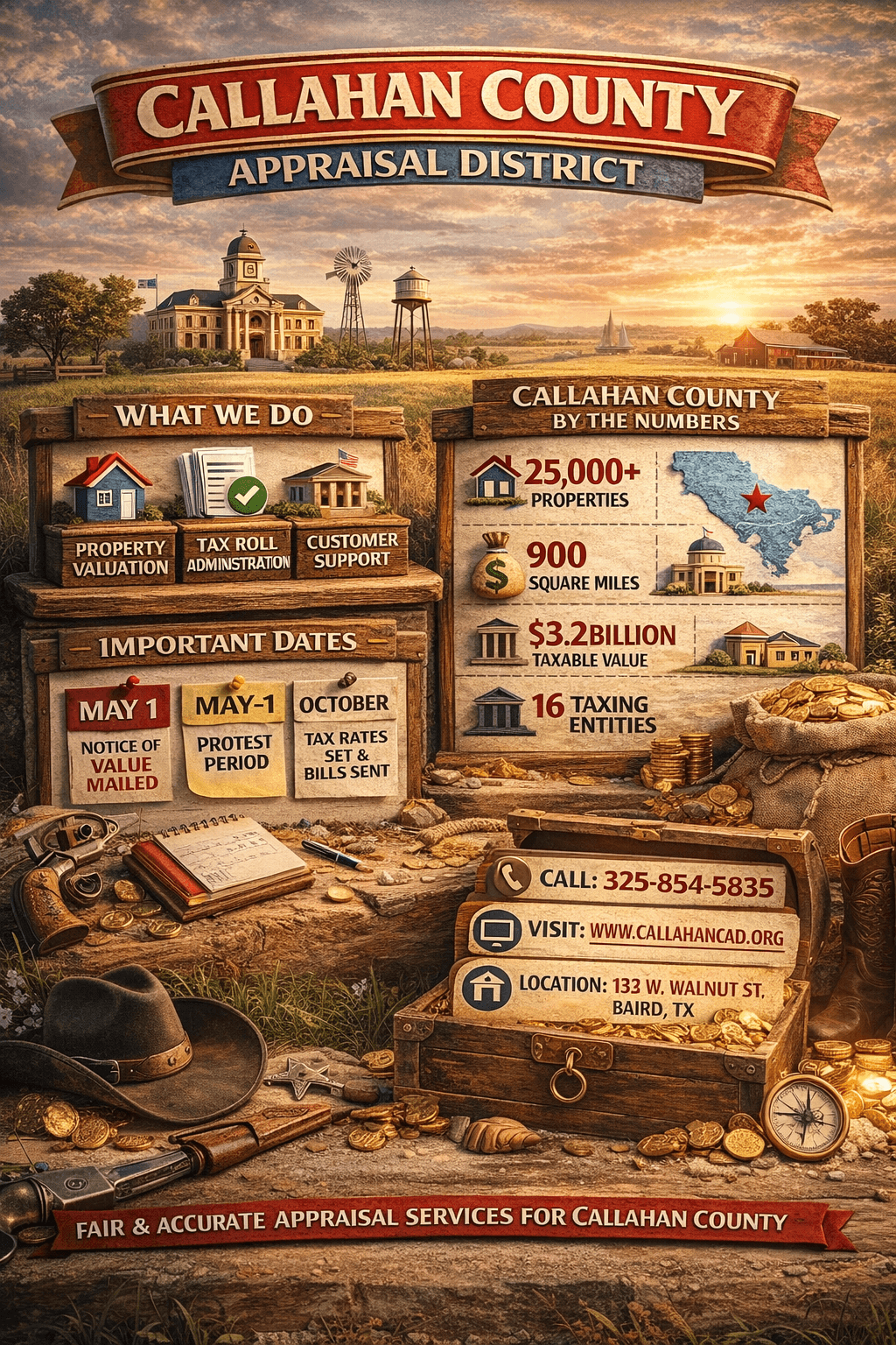 Callahan CAD appraises your property value, but actual taxes are collected by the Tax Assessor-Collector.
